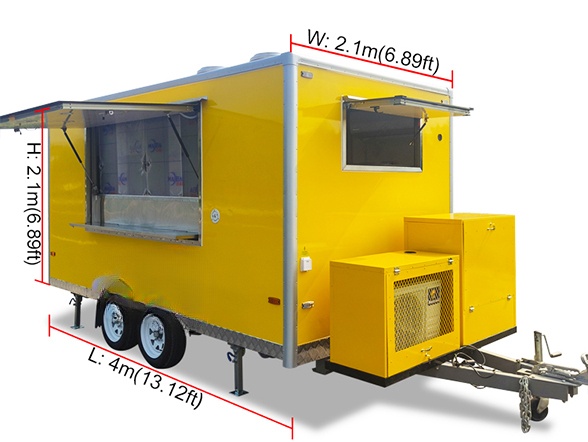 Ideal for ambitious food entrepreneurs, this bright yellow mobile food trailer delivers a standout presence combined with fully functional kitchen capability. At 4 meters (13.12 ft) in length, it remains compact enough for easy towing and maneuvering — yet offers generous internal space for cooking, prepping and serving. Built on a heavy-duty galvanized steel frame with aluminum composite exterior panels and food-grade stainless steel interior, it’s engineered for strength, longevity and hygienic operation. The glossy yellow finish ensures strong visual impact and brand visibility, while the trailer’s ergonomic layout — serving windows, service hatch, ventilation and optional exhaust — supports efficient, smooth workflow. Fully customizable in layout, equipment and branding, it’s a ready-to-go foundation for street-food carts, coffee stands, burger grills, pop-up eateries or event catering setups.